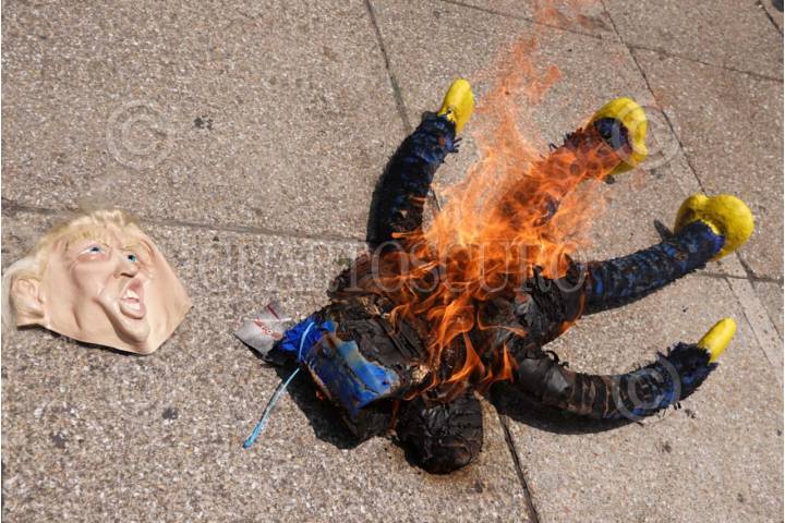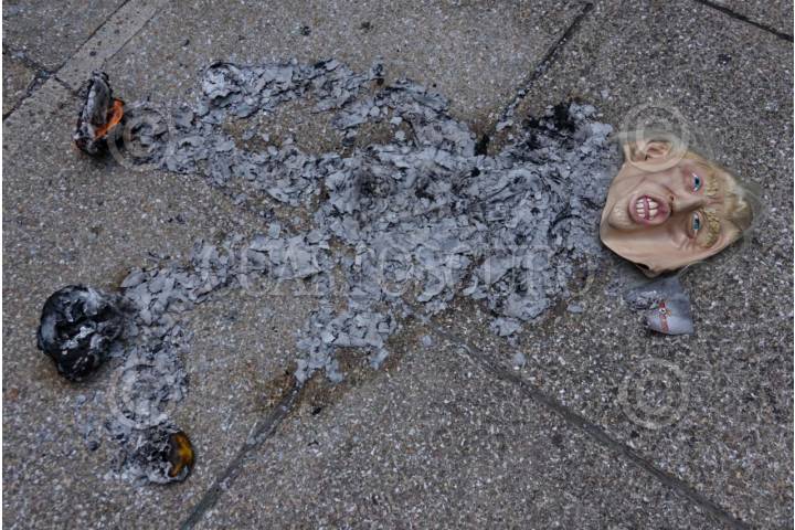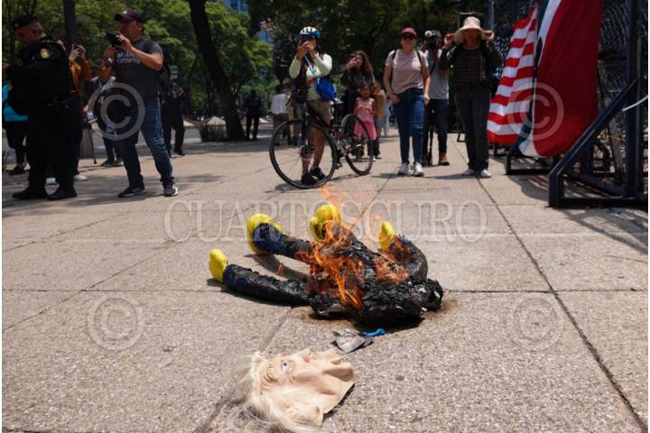 CIUDAD DE MÉXICO, 09JUNIO2025.- Una piñata de Donald Trump, presidente de mis Estados Unidos de América, fue quemada por activistas afuera de la Embajada Americana para exigir justicia por los migrantes detenidos en redadas en Los Ángeles, California, en donde ayer elementos de la Guardia Nacional reprimió un grupo de personas en movilización frente al Centro de Detención Metropolitano de Los Ángeles, California. FOTO: GRACIELA LÓPEZ/CUARTOSCURO.COM