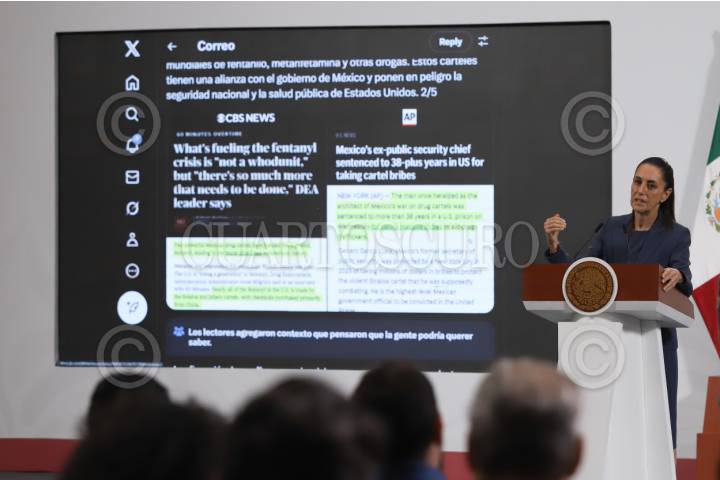CIUDAD DE MÉXICO, 17JULIO2025.- Claudia Sheinbaum, presidenta de México, mostró los dichos de la Casa Blanca cuando destacaron la campaña que realizaba México contra las drogas, esto luego de los dichos del presidente de Estados Unidos, Donald Trump sobre que el narcotráfico tiene el control en distintos políticos mexicanos. FOTO: DANIEL AUGUSTO/ CUARTOSCURO.COM