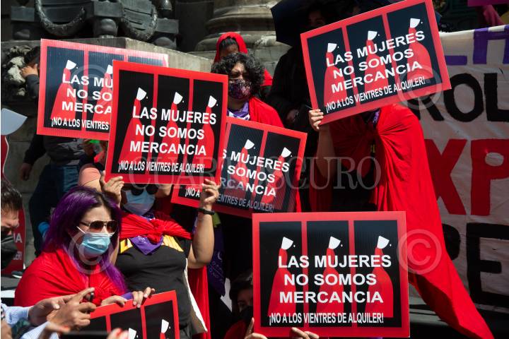 Colectivos feministas se manifestaron al exterior del Congreso de la Ciudad de México para expresar su rechazo a las iniciativas que buscan reconocer la maternidad subrogada como derecho y regularla como práctica médica sin fines de lucro.