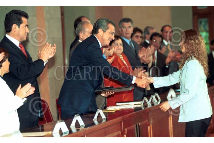 Dora Angélica de la Rocha de El Debate de Culiacan recibe de manos del presidente Ernesto Zedillo el Premio Nacional de Periodismo.