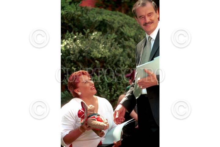 Dora Elia García ganadora de tres medallas en lanzamiento en las pasadas Paraolimpiadas saluda al presidente electo Vicente Fox. FOTO: Pedro Mera/CUARTOSCURO.COM