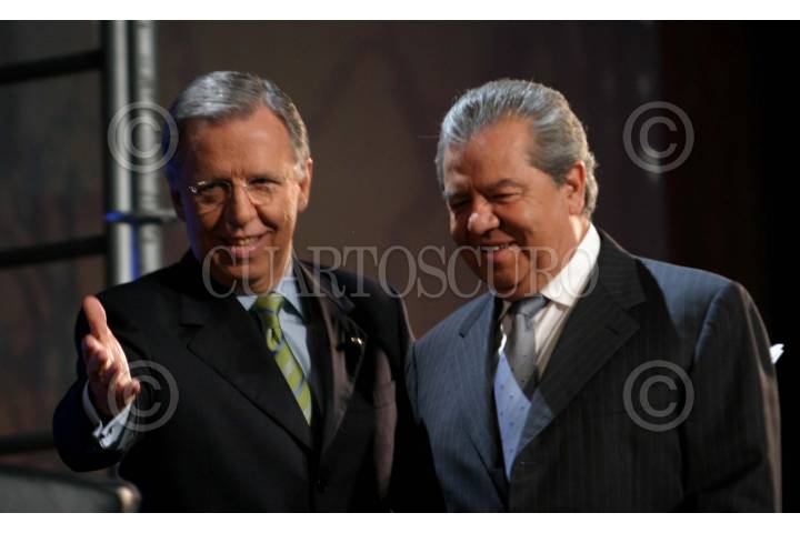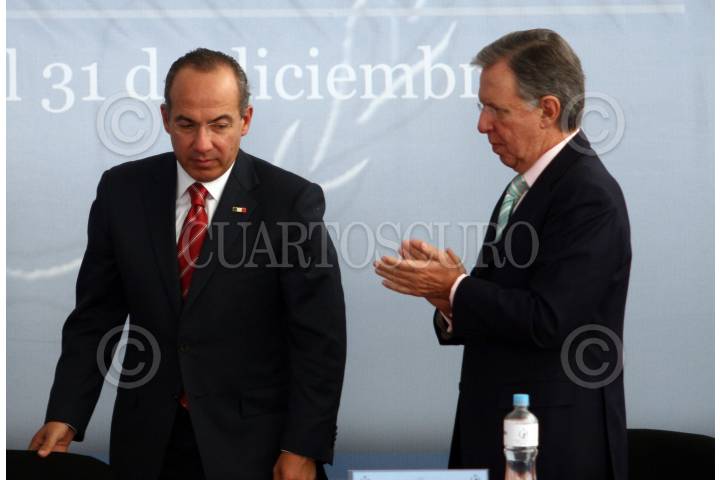 MÉXICO,D,F 15FEREBRO2008.- El Presidente de los Estados Unidos Mexicanos Felipe Calderon Hinojosa y el periodista Joaquin Lopez Dóriga durante el informe de actividades del ombusdman FOTO: SASHENKA GUTIERREZ/CUARTOSCURO.COM
