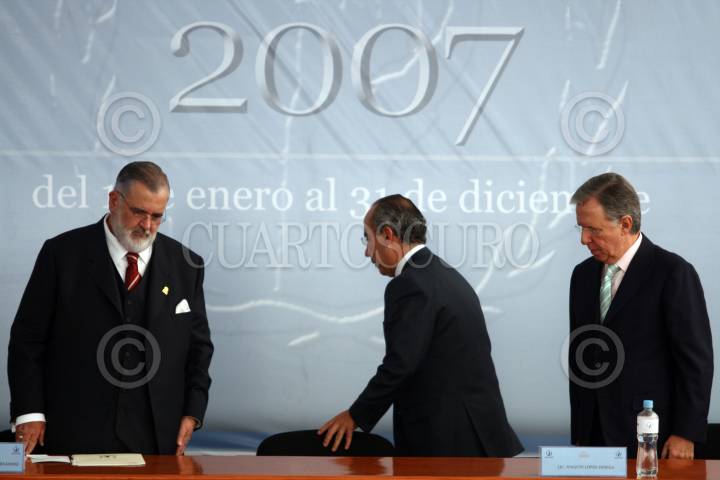 MÉXICO,D,F 15FEREBRO2008.- José Luis Soberanes Presidente dela CNDH el Presidente de los Estados Unidos Mexicanos Felipe Calderon Hinojosa y el periodista Joaquin Lopez Dóriga durante el informe de actividades del ombusdman FOTO: SASHENKA GUTIERREZ/CUARTOSCURO.COM