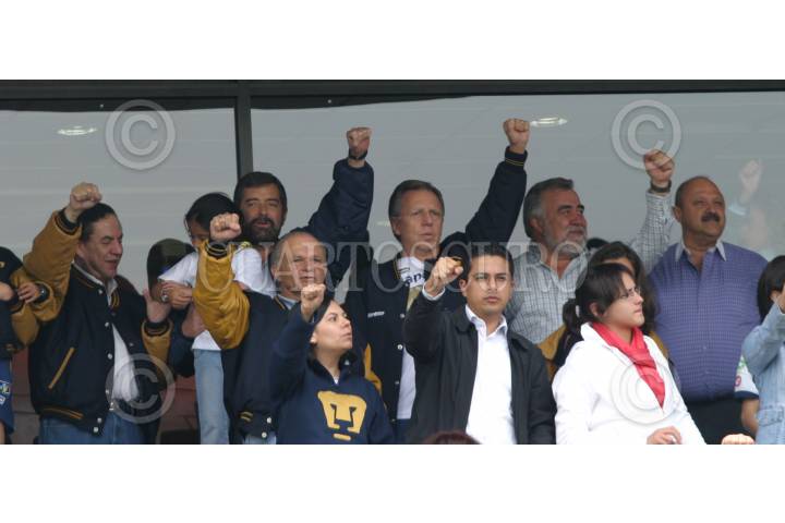MÉXICO D.F. 12NOVIEMBRE2006.- Ealy Ortiz dierector del diario El Universal, José Ramón de la Fuente Rector de la UNAM, López Doriga periodista, Alejandro Encinas jefe de gobierno del D.F. Reyes Tamez Guerra secretario de Educación Publica durante el encuentro donde los Pumas de la UNAM, derrotaron con un marcador de 5 goles a cero a los Tigres de la UANL, en el cierre de la fecha 8 del futbol mexicano en el estadio de Ciudad Universitaria. FOTO: GUILLERMO PEREA /CUARTOSCURO.COM