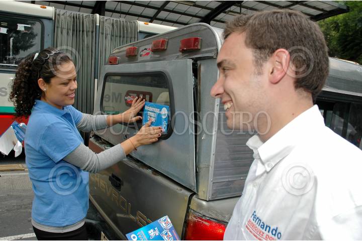 MÉXICO, D.F., 22MAYO2009.- Mariana Gomez del Campo, presidenta del PAN D.F., pega una calcomania a un automovil acompañada de Fernando Rodriguez Doval, candidato a diputado local por la delegación Benito Juarez y Alvaro Obregon, sobre la avenida de los Insurgentes a la altura del monumento Manuel J. Clouthier. FOTO: RODOLFO ANGULO/CUARTOSCURO.COM