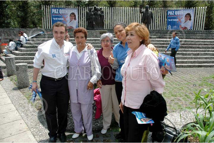 MÉXICO, D.F., 22MAYO2009.- Fernando Rodriguez Doval, candidato a diputado local por la delegación Benito Juarez y Alvaro Obregon y Mariana Gomez del Campo, presidenta del PAN D.F., posan con algunas vecinas del lugar en el monumento a Manuel J. Clouthier en donde repartieron volantes y calcomanias a los transeuntes y automovilistas. FOTO: RODOLFO ANGULO/CUARTOSCURO.COM