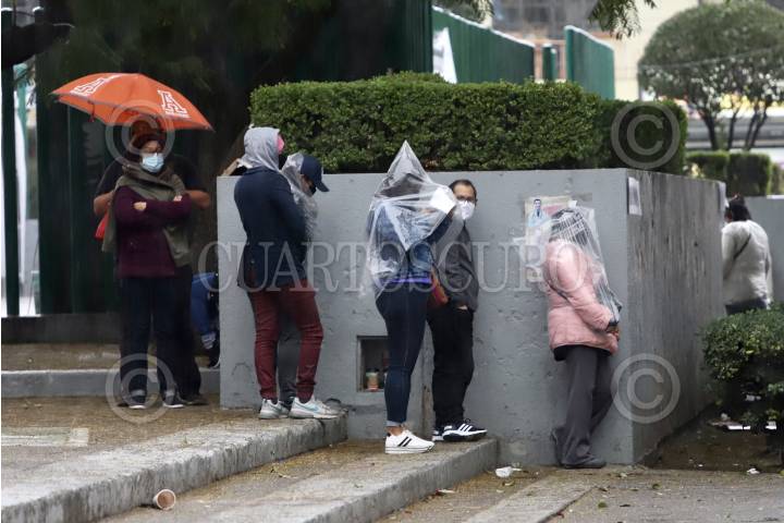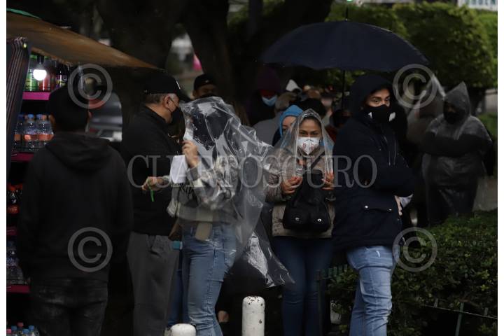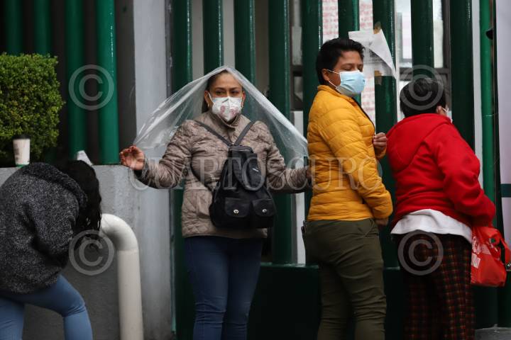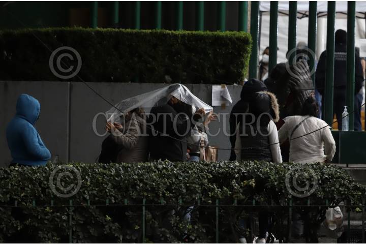 La lluvia que se presentó esta tarde en la capital afectó a personas que se encontraban a la espera de hacerse una prueba para la detección de Covid-19 en el Hospital General Regional 1 Dr. Carlos Mac Gregor Sanchez Navarro.