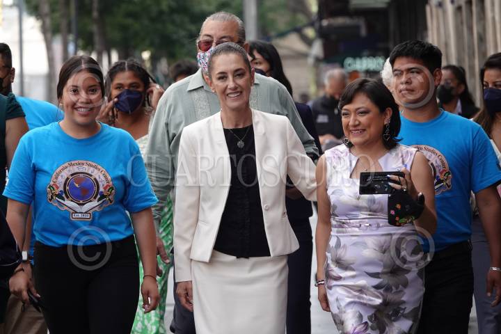 Claudia Sheinbaum y Karina Ruiz, directora Ejecutiva de Arizona Dream Act Coalition, a su arribo para la presentación del libro “Antología de sueños de un viaje imposible”
