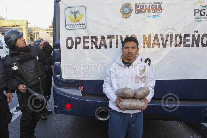 MÉXICO, D.F., 17DICIEMBRE2012.- Un hombre de aproximadamente 28 años, fue detenido con tres que presuntamente eran de mariguana durante un operativo "Navideño" y Pasajero seguro en el puesto montado en Autopista México Puebla a la entrada al D.F. En la colonia Santa Martha Acatitla.de Iztapalapa FOTO: LUIS CARBAYO /CUARTOSCURO.COM