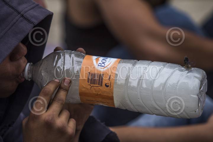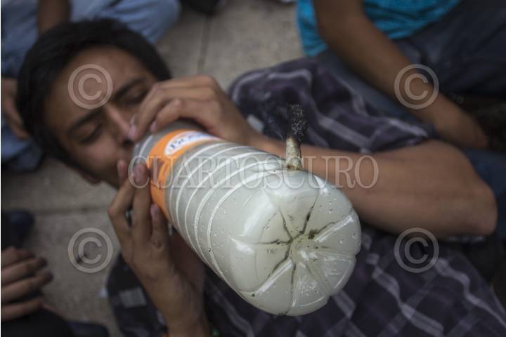 MÉXICO, D.F., 10JUNIO2014.- Un joven en situación de calle inhala solventes, mejor conocido como "mona" mientras come un tamal de dulce. Una encuesta de usuarios de drogas ilegales en la Ciudad de México, revela que la mayoría de los consumidores capitalinos inician entre los 14 y 16 años de edad. FOTO: DIEGO SIMÓN SÁNCHEZ /CUARTOSCURO.COM
