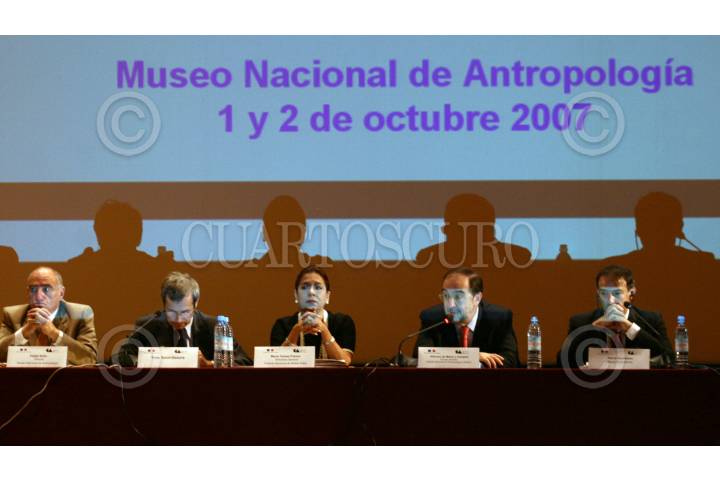 MÉXICO,D,F.,01 OCTUBRE2007.- Pierre Hanoteaux, Representante del Museo Dual Branly,Alfonso de María y Campos Director del Instituto Nacional de Antropología e Historia,María Teresa Franco Directora General del Instituto de Bellas Artes,Yves Saint-Geurs ,Felipe Solis,Director del Museo Nacional de Antropología, durante el encuentro cultural México Francia "Museos del siglo XX, retos y desafíos" FOTO:SASHENKA GUTIERREZ/CUARTOSCURO.COM