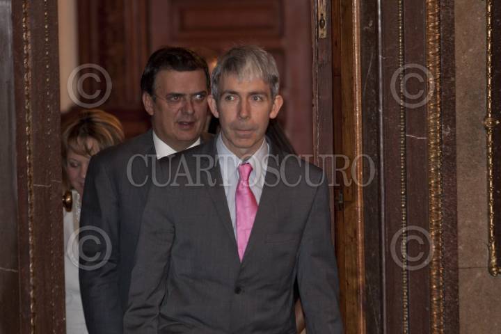 MÉXICO, D.F., 07MARZO2012.- Andrew Montague, alcalde de la ciudad de Dublin, Irlanda, acompañado de Marcelo Ebrard, jefe de gobierno del Distrito Federal durante la entrega de Medalla y Pergamino de Huésped Distinguido que se realizo en el Salón de los Cabildos del Antiguo Palacio del Ayuntamiento. FOTO: RODOLFO ANGULO /CUARTOSCURO.COM
