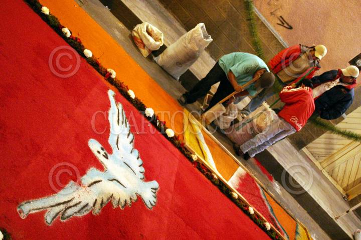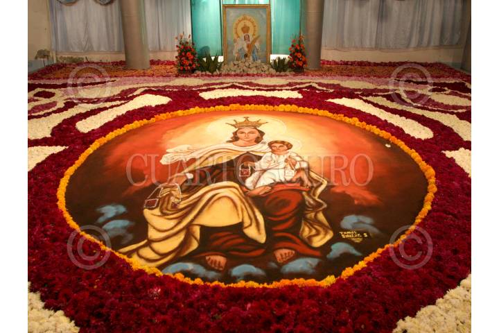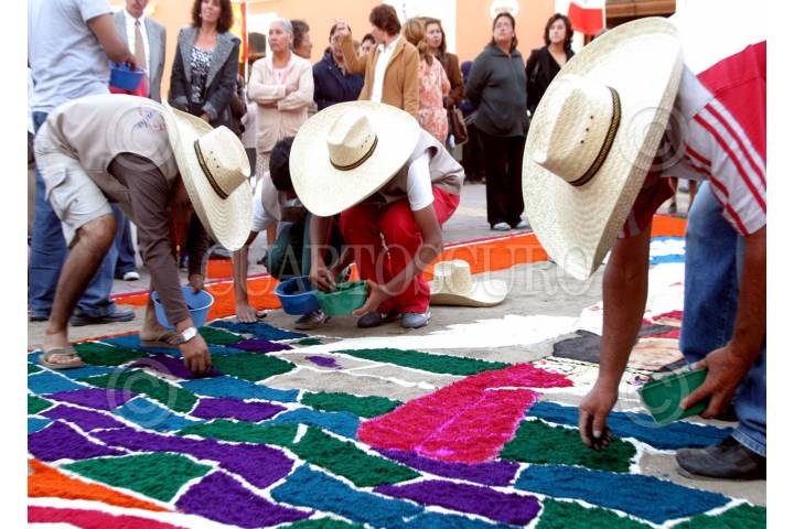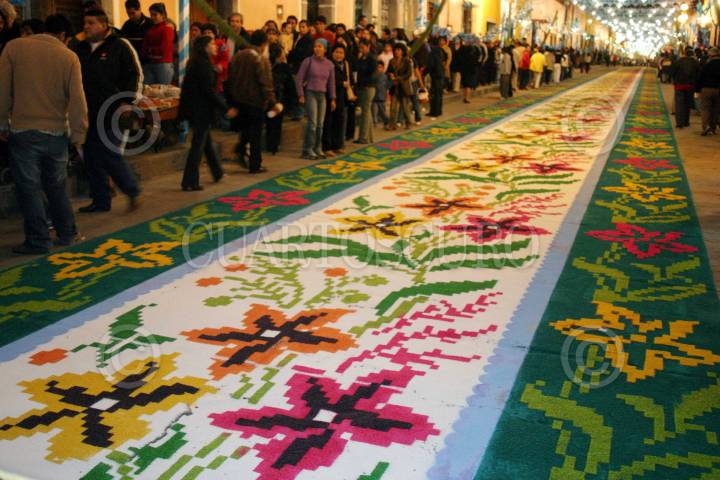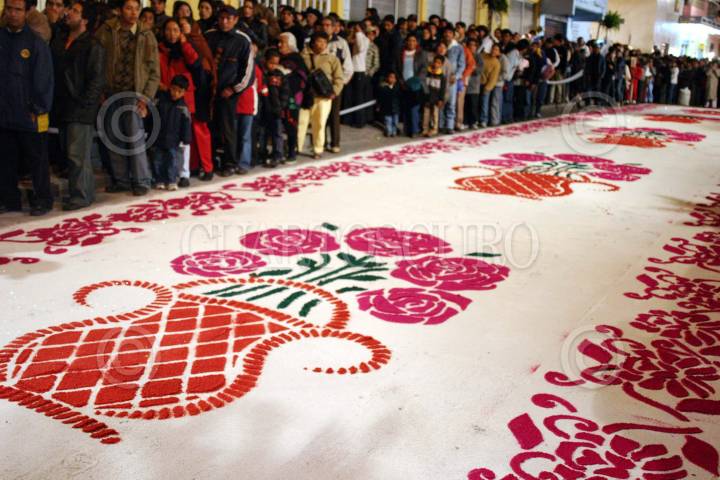 Huamantla, Tlaxcala, 15AGOSTO2004.- La iglesia de la virgen de Santa María de la Caridad, adornada con alfombras, de aquí parte la procesión que vista los barrios aledaños. FOTO: Moisés Pablo/CUARTOSCURO.COM