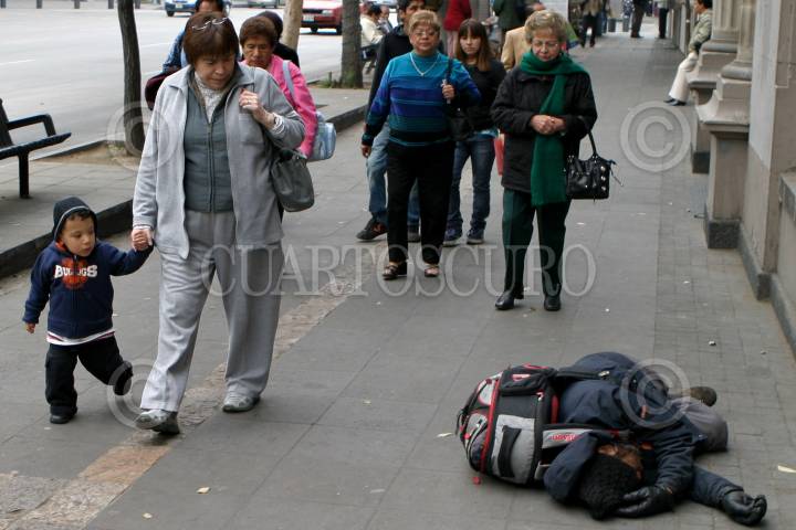 MÉXICO, D.F., 07ENERO2010.- Un hombre en situación de calle duerme sobre una banqueta en calles de la ciudad mientras los transeúntes solo pasan ignorándolo. FOTO: RODOLFO ANGULO/CUARTOSCURO.COM