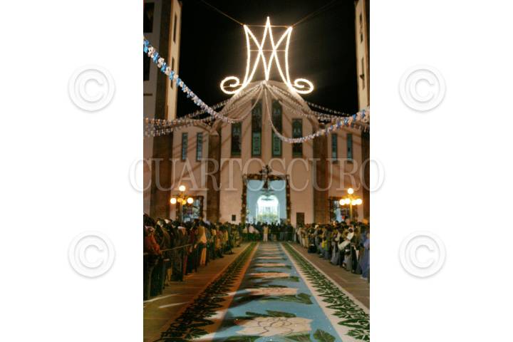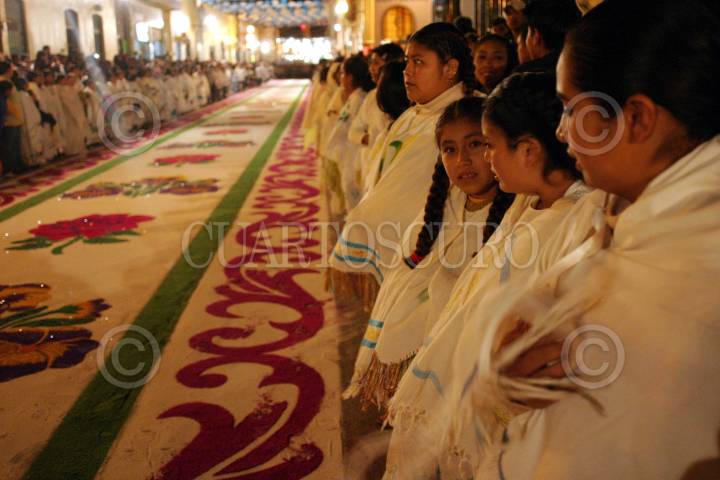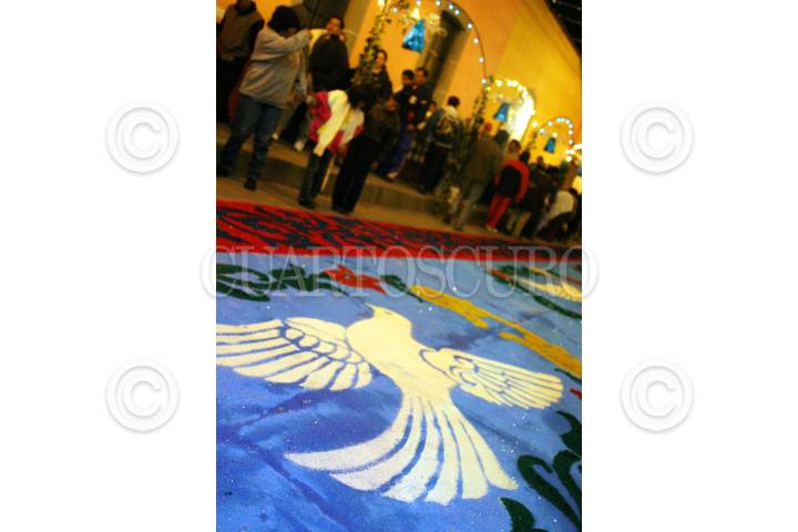 Huamantla, Tlaxcala, 15AGOSTO2004.- Conocida como la "Noche que Nadie Duerme", las celebraciones de la virgen de Santa maría de la Caridad duran toda la noche, la procesión visita todas las calles del barrio que han sido ataviadas de alfombras con diverso motiovos. FOTO: Moisés Pablo/CUARTOSCURO.COM