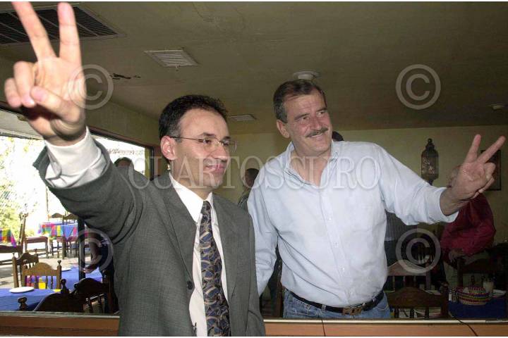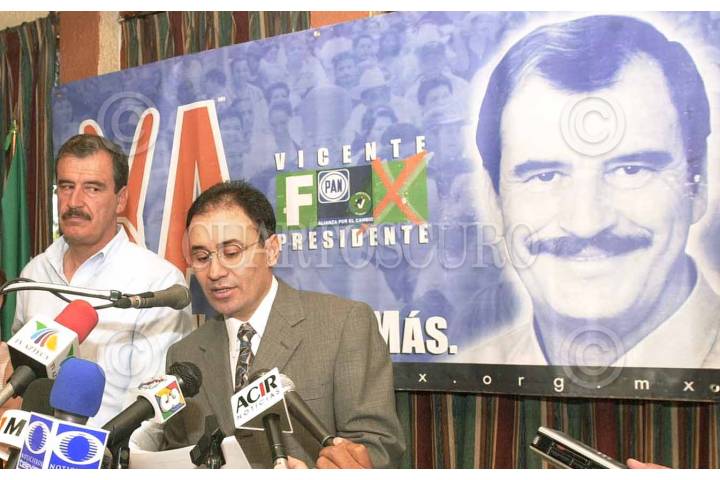 Vicente Fox y el ex secretario de Luis Donaldo Colosio, Alfonso Durazo, durante la conferencia en la que se anunció la adhesión del ex priista a la campaña del guanajuatense.