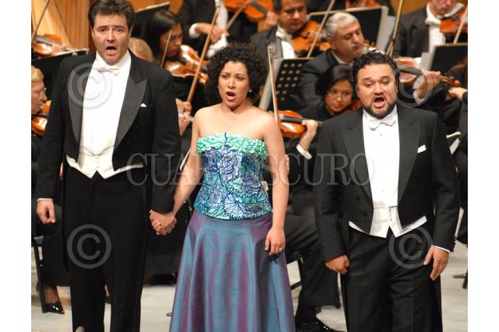 MORELIA, MICHOACÁN 01DICIEMBRE2008.- La soprano, María Katzarava acompañada de los tenores, José Luis Duval y Ramón Vargas, durante la presentación de clausura del XX Fetsival de Música de Morelia, que se realizó en el Teatro Morelos. FOTO: FRANCISCO SEGURA/ CUARTOSCURO.COM