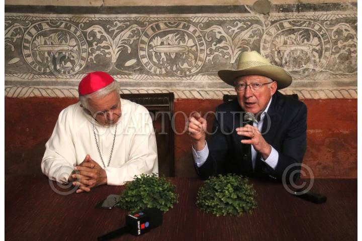 CUERNAVACA, MORELOS, 05ENERO2025.- Conferencia de prensa del obispo de la Diócesis de Cuernavaca y presidente de la Conferencia del Episcopado Mexicano, Ramon Castro Castro y el embajador de Estados Unidos en México, Ken Salazar. A a unos días de dejar el país el Embajador recomendó a la presidenta Claudia Sheinbaum Pardo escuchar los consejos de otros sectores, como la iglesia. FOTO: MARGARITO PÉREZ RETANA/CUARTOSCURO.COM