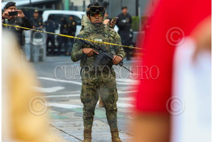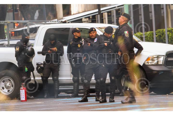 CIUDAD DE MÉXICO. 03FEBRERO2025.- Red Binacional contra Trump, realizaron un mitin frente a la embajada de Estados Unidos de América; demandaron que el paisa vecino de trato digno a los conacionales que encuentra trabajado y radicando en EEUU. Policías de la CDMX e integrantes de la Marina en las afueras de la embajada norteamericana. FOTO: VICTORIA VALTIERRA/CUARTOSCURO.COM