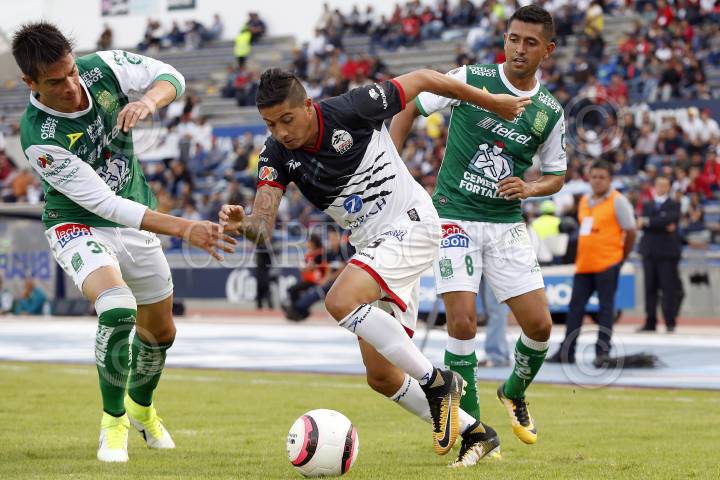 PUEBLA, PUEBLA, 30SEPTIEMBRE2017.- El jugador Emanuel Herrera pelea el balón entre los jugadores Juan González y Elías Hernández durante jugada del partido entre Lobos BUAP y el Club León con marcador final 0-3 correspondiente a la jornada 12 del torneo de Apertura de la Liga MX. FOTO: HILDA RÍOS /CUARTOSCURO.COM