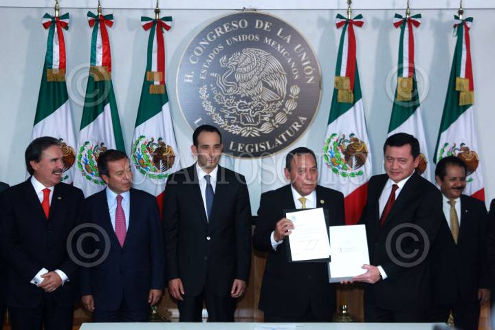 MÉXICO, D.F., 01SEPTIEMBRE2015.- Jesús Zambrano Grijalba, presidente de la mesa directiva de la Cámara de Diputados, recibió de Miguel Angel Osorio Chong, Secretario de Gobernación, el Tercer Informe de Gobierno de la administración del presidente Enrique Peña Nieto, en el salón de protocolos del recinto legislativo de San Lázaro, donde estuvieron acompañados por los coordinadores Emilio Gamboa Patrón y César Camacho, del PRI, Roberto Gil Zuarth, y Luis Sánchez, presidente y vicepresidente del Senado, respectivamente. FOTO: SAÚL LÓPEZ /CUARTOSCURO.COM
