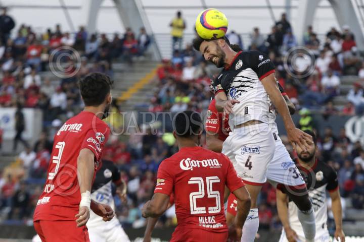 PUEBLA, PUE., 31MARZO2018.- El jugador Facundo Erpen, gana el balón en jugada de cabeza ante los Diablos Rojos de Toluca correspondiente a la jornada 13 del torneo Clausura 2018 de la Liga MX celebrado en el estadio olímpico universitario. FOTO: HILDA RÍOS /CUARTOSCURO.COM