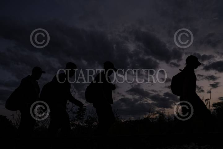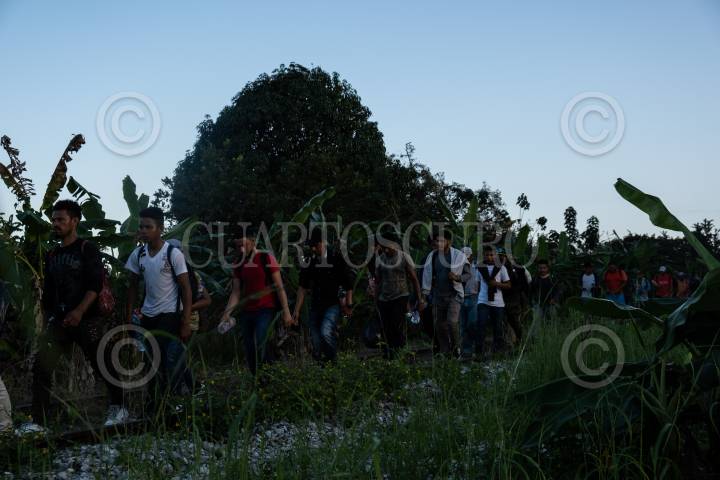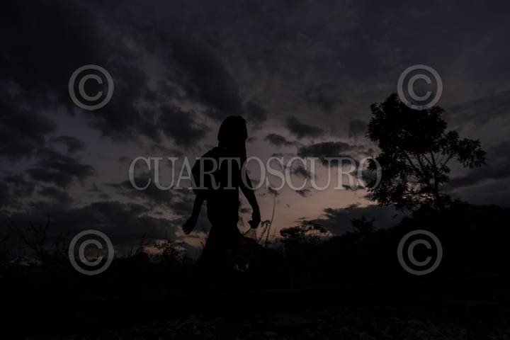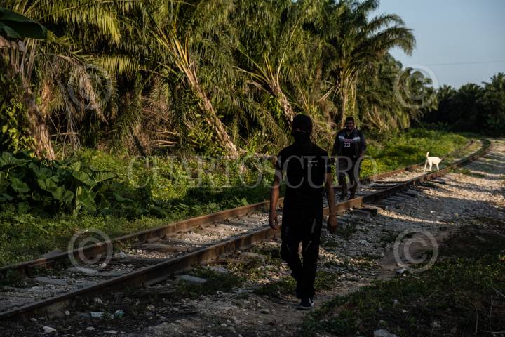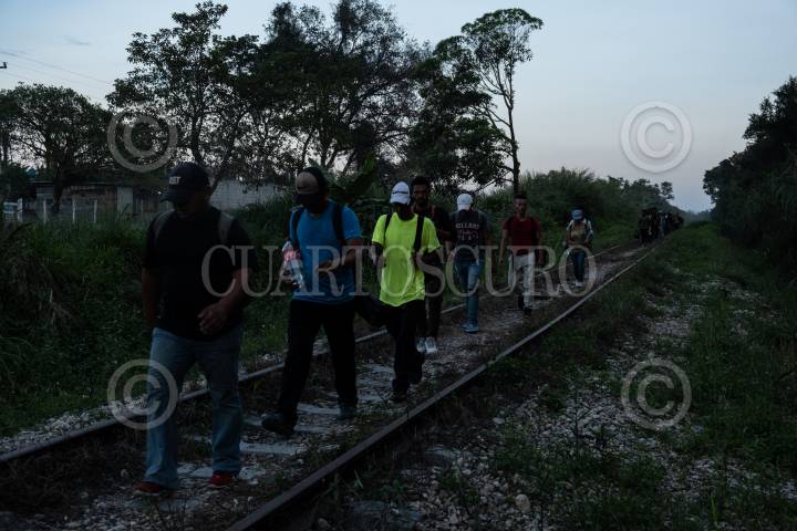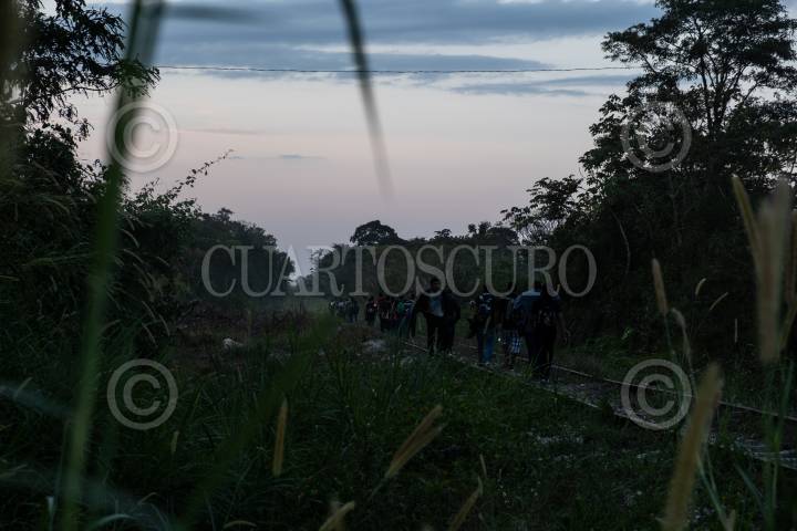 Migrantes hondureños durante su travesía rumbo al norte del país sobre las vías del tren entre Palenque y Salto del Agua.
