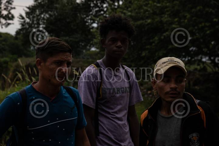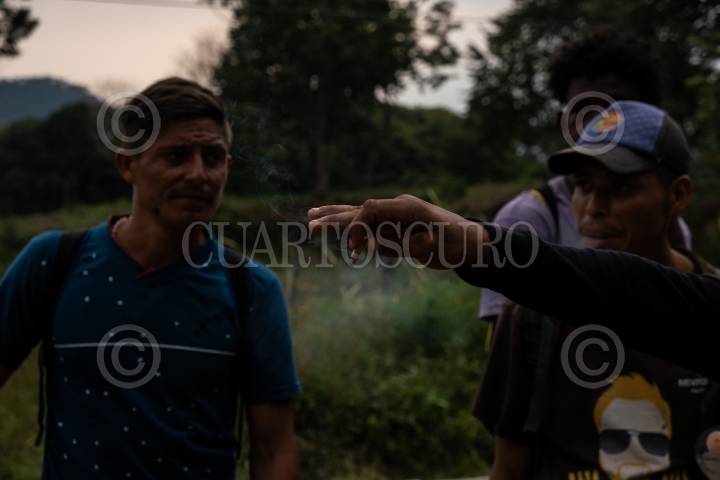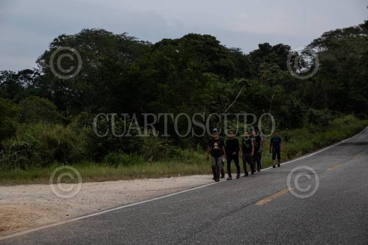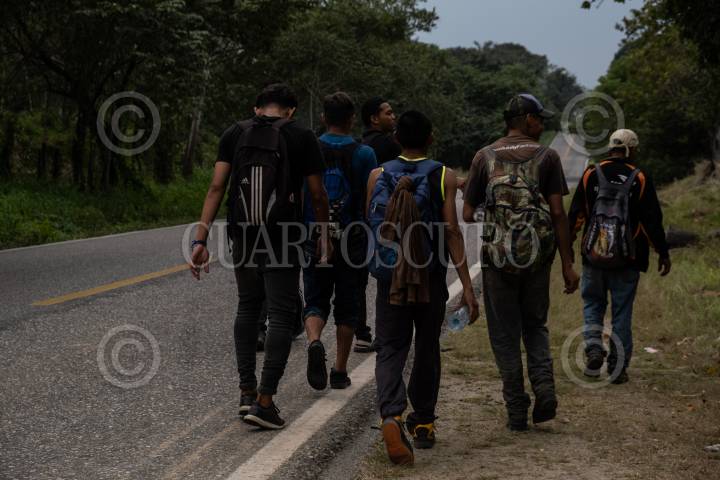 Migrantes hondureños caminas sobre la carretera Palenque con rumbo a Coatzacoalcos para lograr abordar el tren La Bestia y continuar su camino hacia la frontera sur de México.
