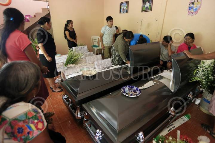 XALTEPEC, PUEBLA, 08AGOSTO2016.- Familias y vecinos velan el cuerpo de 6 menores y un adulto fallecidos a causa del desborde de ríos tras el paso del fenómeno metereológico Earl por el estado de Puebla. Al momento oficialmente son 30 personas quienes han perdido la vida y continúa la búsqueda de por lo menos 5 personas desaparecidas mas. FOTO: HILDA RÍOS /CUARTOSCURO.COM