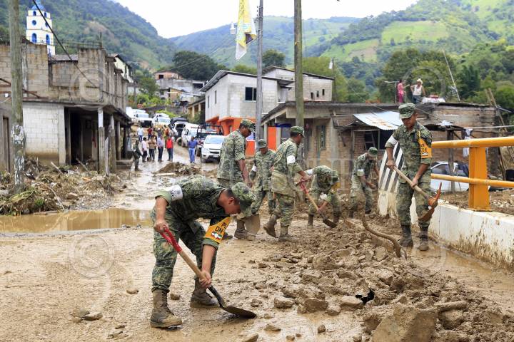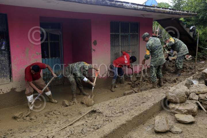 XALTEPEC, PUEBLA, 07AGOSTO2016.- Cientos de personas resultaron afectadas por los desbordamientos de ríos y deslaves de barrancas, provocados por la intensa lluvia tras el paso de la tormenta tropical Earl por el municipio de Huauchinango. Oficialmente, la cifra ha llegado a 28 víctimas; personal del ejército labora en la aplicación del Plan de Auxilio a la Población Civil en Casos de Desastre (DN-III-E). FOTO: HILDA RÍOS /CUARTOSCURO.COM