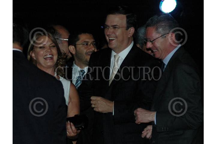 MÉXICO D.F., 06JUNIO2009.- Marcelo Ebard, jefe de gobierno del D.F., acompañado de su esposa Mariagna Prats conversan con Alberto Ruíz Gallardon, alcalde de Madrid y presidente de la UCCI (Unión de Ciudades Capitales Iberoamericanas) a su llegada a la cena de bienvenida ofrecida por el gobierno local por la Cumbre de autoridades locales de las capitales iberoamericanas que se realizo en el museo Huellas de la Vida ubicado en la plancha del Zocalo capitalino. FOTO: RODOLFO ANGULO/CUARTOSCURO.COM