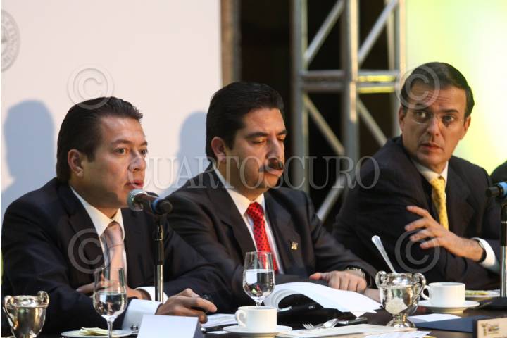 MÉXICO, D.F., 04NOVIEMBRE2010.- Juan de Dios Barba Nava, de la Confederación Patronal de la República Mexicana; Marcelo Ebard, jefe de gobierno del Distrito Federal y Sergio Cervantes Rodiles de la Cámara Nacional de la Industria de la Transformación durante el encuentro con Cámaras de Comercio "Por un Presupuesto Digno para la Ciudad" que se realizo en el Club de Banqueros. FOTO: RODOLFO ANGULO/CUARTOSCURO.COM