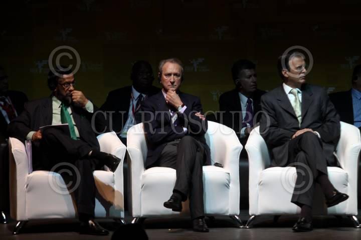 MÉXICO, D.F., 18NOVIEMBRE2010.- Rajendra K. Pachauri, presidente del Bureau Panel Internacional Sobre el Cambio Climatico y premio Nobel 2007; Bertrand Delanoë, alcalde de Paris, Francia y Marcelo Ebard, jefe de gobierno del Distrito Federal durante la ceremonia de apertura de la Cumbre Mundial de Líderes Locales y Regionales 2010 que se realizo en el Teatro Metropolitan. FOTO: RODOLFO ANGULO/CUARTOSCURO.COM