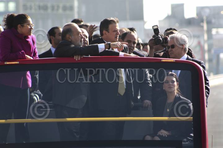 MÉXICO, D.F., 03DICIEMBRE2012.- Marcelo Ebrad, Jefe de Gobierno, acompañado del empresario, Carlos Slim, durante la inauguración del último tramo de la autopista urbana norte y sur. FOTO: CUARTOSCURO.COM