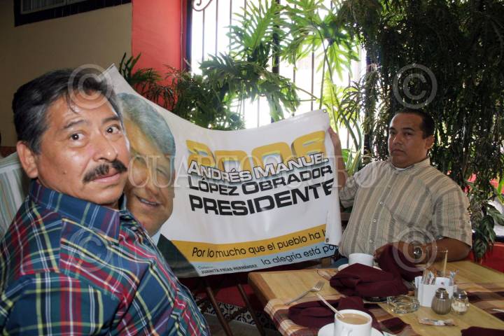VILLAHERMOSA, TABASCO, 22FEBRERO2006.- El diputado del PRD Eber Sánchez (I) muestra una pancarta con la imagen impresa del candidato "Por el Bien de Todos" Andres Manuel López Obrador, momentos antes de celebrase una reunión con militantes fundadores del Partido de la Revolución Democrática. FOTO: Marco Polo Guzman/CUARTOSCURO.COM