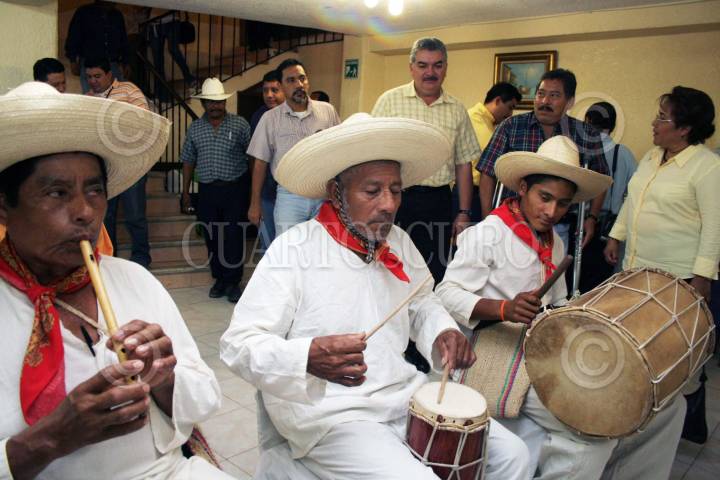 VILLAHERMOSA, TABASCO, 22FEBRERO2006.- Tamborileros Chontales estuvieron presentes en la reunión de militantes fundadores y diputados del PRD, para buscar la unidad partidista a favor de Andres Manuel López Obrador, detras observan los legisladores; Carlos Mario Cano Ocampo, Eber Sánchez y Juana Frias. FOTO: Marco Polo Guzman/CUARTOSCURO.COM