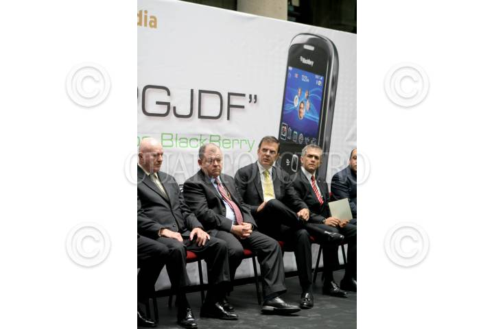 MÉXICO, D.F., 10MARZO2011.- Manuel Mondragón y Kalb, Secretario de Seguridad Pública, Edgar Elías Azar, presidente del Tribunal Superior de Justicia del DF, Marcelo Ebrrad Casaubón, Jefe de Gobierno y Miguel Ángel Mancera, Procurador General de Justicia del DF, durante la presentación de la aplicación para BlackBerry que permite a los usuarios utilizar el MP Virtual para presentar denuncias por delitos como fraude o robo sin violencia FOTO: MOISÉS PABLO/CUARTOSCURO.COM