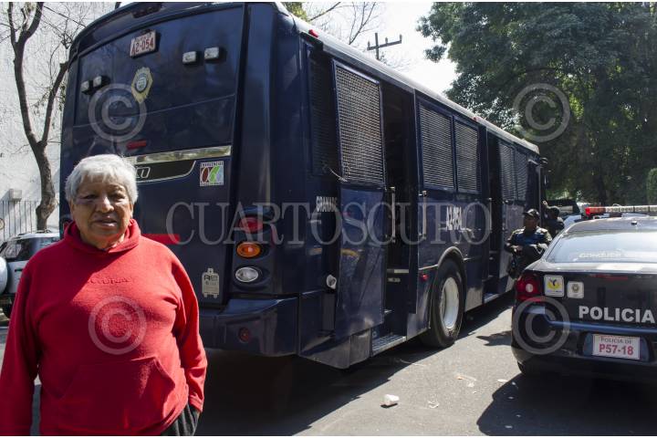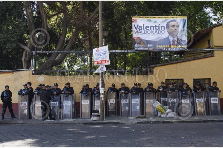 MÉXICO, DF., 01MARZO2014.- Vecinos del barrio de Santa Catarina en Coyoacán, inconformes con respecto a la colocación de parquímetros de la empresa Ecoparq, intentaron obstruir las tareas de balizamiento sobre la calle Francisco Sosa desde temprano esta mañana. Un dispositivo de seguridad fue desplegado en toda la zona y bloquearon la protesta vecinal; algunos vecinos resultaron agredidos. Tras haber bloqueado ayer la avenida Miguel Ángel de Quevedo, lograron un acuerdo con autoridades delegacionales para entablar una mesa de diálogo este lunes 03 de marzo a las 17:00 horas. FOTO: MARÍA JOSÉ MARTÍNEZ /CUARTOSCURO.COM