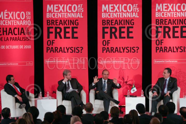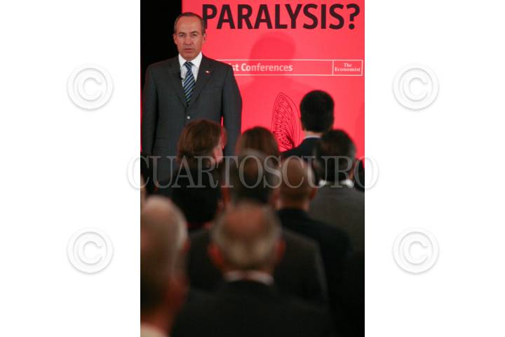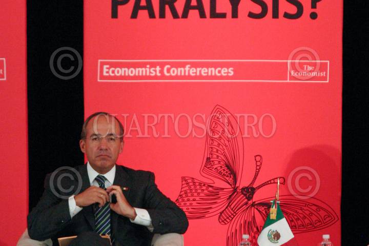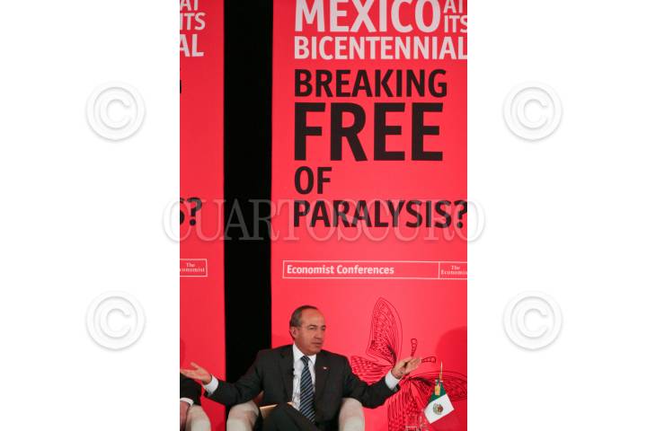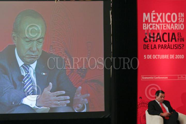 MÉXICO, D.F., 05OCTUBRE2010.- Felipe Calderón Hinojosa, presidente de México, participó en el ciclo de conferencias: Mexico Summit 2010, México en su bicentenario: ¿Saliendo de la parálisis?, que organiza el The Economist. La conferencia titulada "La Perspectiva del Gobierno: Cumpliendo las promesas de largo plazo" el cual encabezó, se realizó en el hotel Four Seasons, ubicado en Paseo de la Reforma. FOTO: MISAEL VALTIERRA/CUARTOSCURO.COM