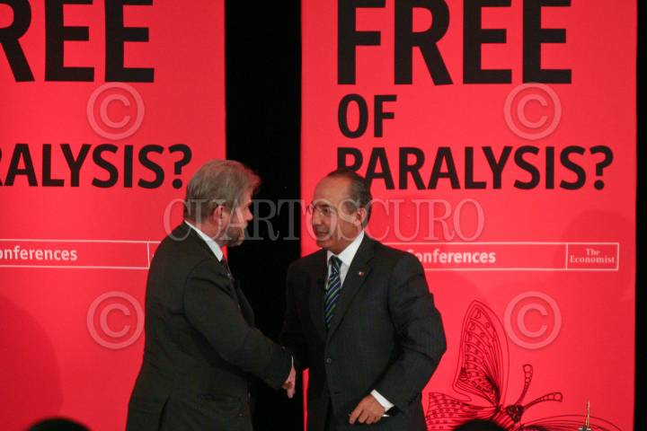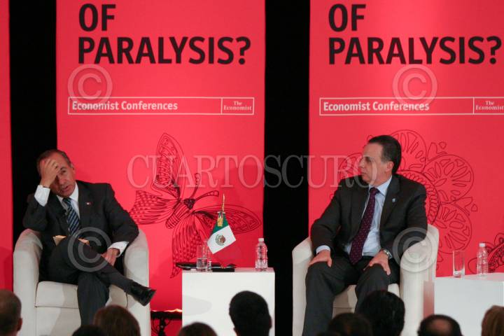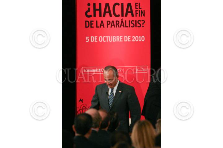 MÉXICO, D.F., 05OCTUBRE2010.- Felipe Calderón Hinojosa, presidente de México y Bruno Ferrari, secretario de Economía (SE), participaron en el ciclo de conferencias: Mexico Summit 2010, México en su bicentenario: ¿Saliendo de la parálisis?, que organiza el The Economist. La conferencia titulada "La Perspectiva del Gobierno: Cumpliendo las promesas de largo plazo" el cual encabezó el presidente, se realizó en el hotel Four Seasons, ubicado en Paseo de la Reforma. FOTO: MISAEL VALTIERRA/CUARTOSCURO.COM
