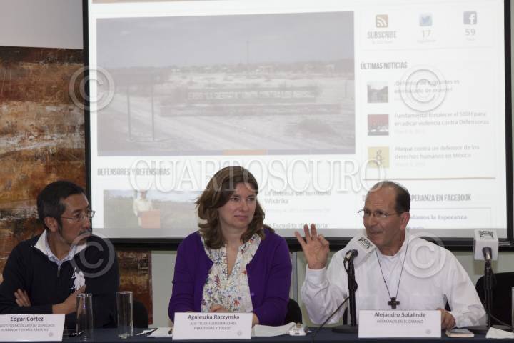MÉXICO, D.F., 20MARZO2013.- Edgar Cortez, instituto mexicano de Derechos Humanos y Democracia A.C., Agnieszka Raczynska, red "Todos los derechos para Todas y Todos", y Alejandro Solinde, "Hermanos en el Camino", durante la presentación de la campaña nacional en favor de las defensoras y defensores de derechos humanos. FOTO: MOISÉS PABLO /CUARTOSCURO.COM