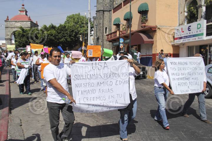 CUERNAVACA, MORELOS, 21ENERO2014.- Familiares y amigos del mexicano Edgar Tamayo, quien será ejecutado el día de mañana en Estados Unidos, se manifestaron en las calles del centro partiendo de la iglesia del Calvario a la Plaza de Armas portando cartulinas en contra de la pena de muerte. FOTO: PATRICIA MORALES /CUARTOSCURO.COM