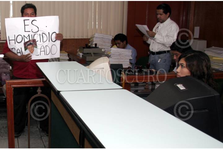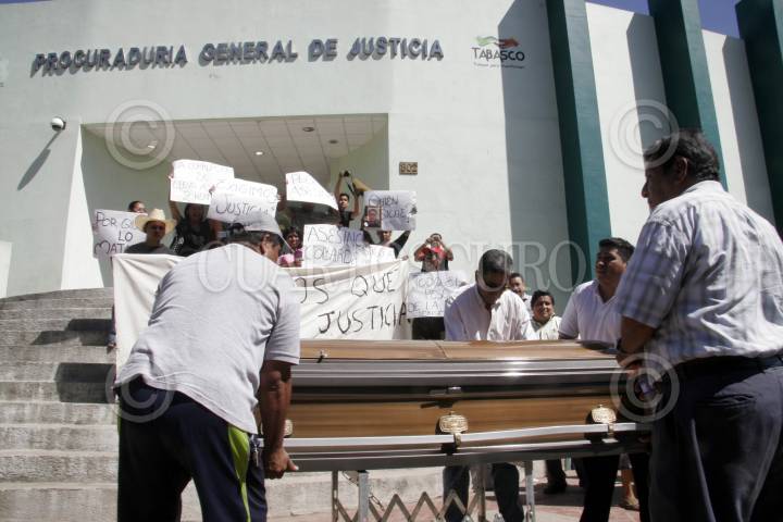 VILLAHERMOSA, TABASCO, 29ENERO2008.- El féretro con el cuerpo sin vida de Edgardo Reyes Castellanos fue razón de protesta en la explanada principal de la Procuraduría General de Justicia. Ahí familiares y amigos del fallecido por homicidio en manos de un policía ministerial se manifestaron energéticamente. Posteriormente a la manifestación acudieron al panteón de la colonia Sabina para continuar con los procesos de sepultura. FOTO: MARCO POLO GUZMÁN HERNÁNDEZ/CUARTOSCURO.COM