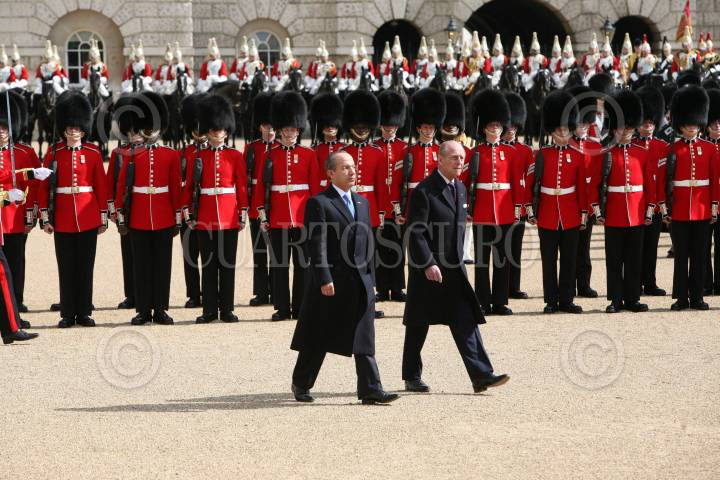 LONDRES, INGLATERRA, 30MARZO2009.- El presidente de México, Felipe Calderón Hinojosa, junto con el Duque de Edimburgo, durante la ceremonia de bienvenida del cual fué objeto de reconociemiento por la Reyna Isabel II, por su visita de estado que realiá en este país. Ésto sucedió en la explanada Horse Guards Parade del Palacio de Buckingham. FOTO: ARIEL GUTIERREZ/CUARTOSCURO.COM