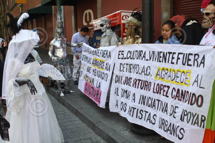 MÉXICO, D.F., 21OCTUBRE2010.- Esculturas vivientes se manifestaron en apoyo de a la diputada Edith Ruíz Mendicuti, quien según ellos a propuesto iniciativas en apoyo a su actividad comercial en el primer cuadro de la capital, la protesta se dio afuera de la Asamblea Legislativa del DF. FOTO: MOISÉS PABLO/CUARTOSCURO.COM