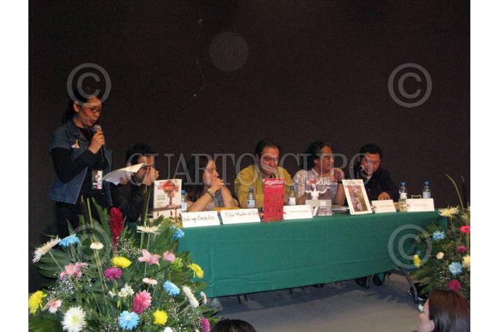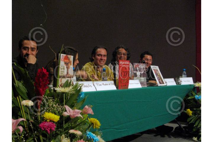 AGUASCALIENTES, AGUAS, 26SEPTIEMBRE20O8.- Editores y Directores de diversas revistas como: Rogelio Castillo de la revista Tierra Adentro, Pilar Montes de Oca de Algarabía, Gustavo Vazquez de la revista Parteaguas, Pedro Valtierra de Cuartoscuro y Yassir Zárate de Complot, durante la conferencia que se realizó en torno a la feria del libro de dicha entidad. FOTO: OSCAR JOSÉ GARCÍA SANDOVAL/CUARTOSCURO.COM