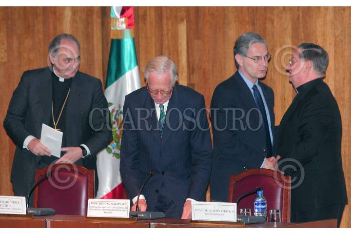 MÉXICO, D. F. 05JUNIO2004.- El Mons. Marcelo Sánchez Sorondo, Edmond Malinvaud, Luis Ernesto Derbez y Giuseppe Bertello en la clausura del coloquio "Globalización y justicia Internacional". FOTO: Iván Stephens/CUARTOSCURO.COM