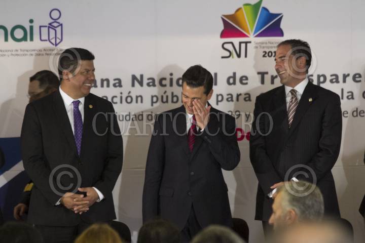 CIUDAD DE MÉXICO, 28SEPTIEMBRE2016.- Edmundo Javier Bolaños, presidente de la mesa directiva de la Cámara de Diputados; Enrique Peña Nieto, Presidente de México; Pablo Escudero, presidente del Senado, y Ximena Puente de la Mora, presidenta del INAI, durante la semana nacional de transparencia 2016, organizado por el Instituto Nacional de Transparencia, Acceso a la Información y Protección de Datos Personales (INAI). FOTO: MOISÉS PABLO /CUARTOSCURO.COM