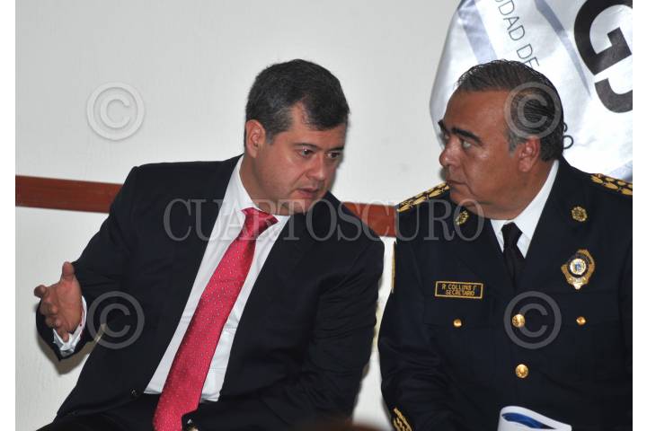 CIUDAD DE MÉXICO, 24JULIO2018.- Edmundo Garrido, procurador general de Justicia de la Ciudad de México, y José Ramón Amieva, el jefe de Gobierno de la ciudad, durante la inauguración el stand de tiro, así como el banderazo de salida de nuevos autopatrullas de la dependencia, en las inmediaciones del Centro de Capacitación y Adiestramiento de la Policía de Investigación. El nuevo stand tiene como fin mejorar las tácticas para la defensa de los elementos de seguridad ante una agresión con arma de fuego, o bien, la detención de delincuentes. Asimismo, se realizó una muestra de tácticas de neutralización en combate directo. FOTO: GALO CAÑAS /CUARTOSCURO.COM
