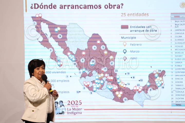 CIUDAD DE MÉXICO, 10ENERO2025.- Edna Vega Rangel, titular de la SEDATU, muestra el plan nacional de vivienda y como se configurará en la República Mexicana, durante la mañanera del pueblo. FOTO: MOISÉS PABLO/CUARTOSCURO.COM
